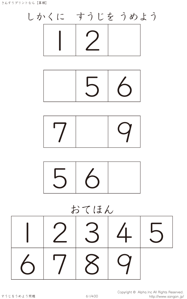 上記のボタンから「しかくにすうじをうめよう」の算数数学ドリル・計算ドリル(PDFプリント)がダウンロードできます。個人利用は無料です(家庭以外での配布は有料です)。