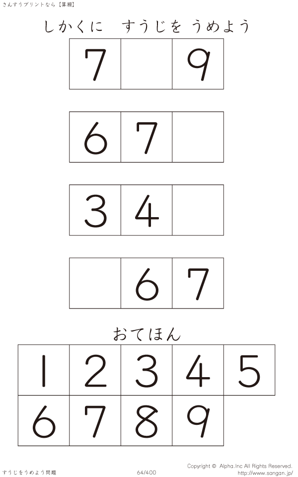 上記のボタンから「しかくにすうじをうめよう」の算数数学ドリル・計算ドリル(PDFプリント)がダウンロードできます。個人利用は無料です(家庭以外での配布は有料です)。