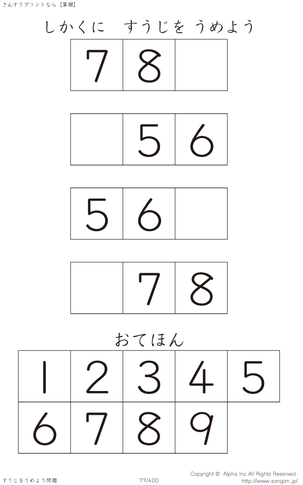 上記のボタンから「しかくにすうじをうめよう」の算数数学ドリル・計算ドリル(PDFプリント)がダウンロードできます。個人利用は無料です(家庭以外での配布は有料です)。