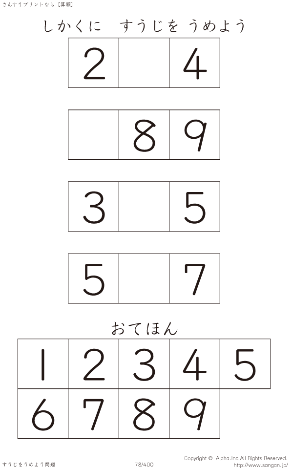 上記のボタンから「しかくにすうじをうめよう」の算数数学ドリル・計算ドリル(PDFプリント)がダウンロードできます。個人利用は無料です(家庭以外での配布は有料です)。
