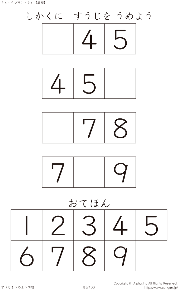 上記のボタンから「しかくにすうじをうめよう」の算数数学ドリル・計算ドリル(PDFプリント)がダウンロードできます。個人利用は無料です(家庭以外での配布は有料です)。