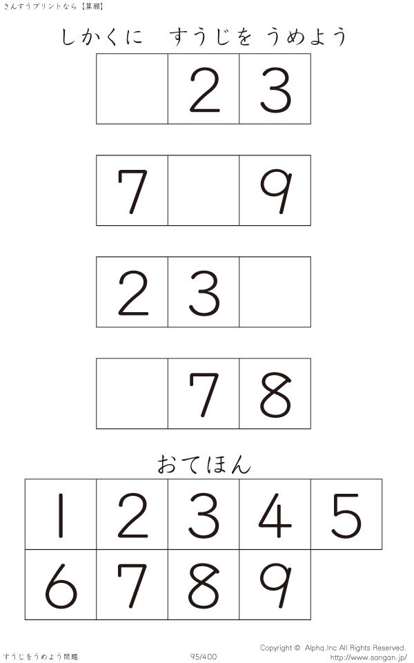 上記のボタンから「しかくにすうじをうめよう」の算数数学ドリル・計算ドリル(PDFプリント)がダウンロードできます。個人利用は無料です(家庭以外での配布は有料です)。