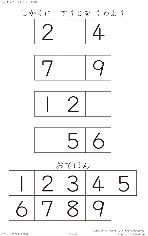 上記のボタンから「しかくにすうじをうめよう」の算数数学ドリル・計算ドリル(PDFプリント)がダウンロードできます。個人利用は無料です(家庭以外での配布は有料です)。
