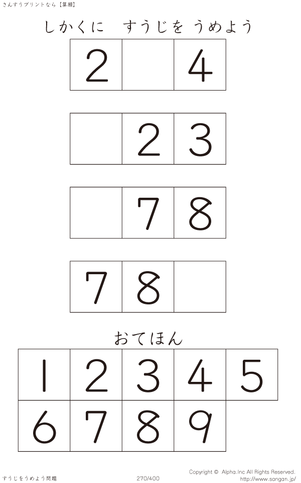 上記のボタンから「しかくにすうじをうめよう」の算数数学ドリル・計算ドリル(PDFプリント)がダウンロードできます。個人利用は無料です(家庭以外での配布は有料です)。