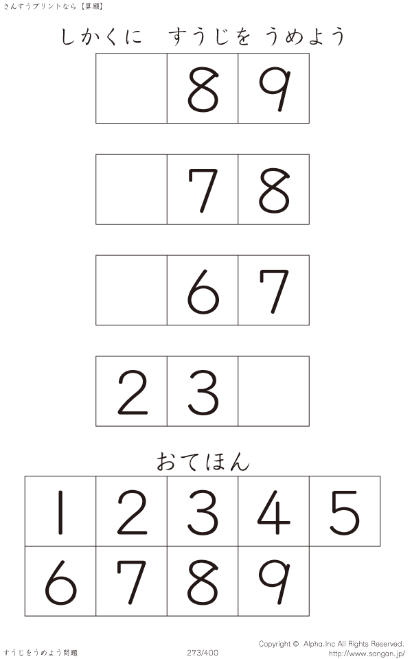 上記のボタンから「しかくにすうじをうめよう」の算数数学ドリル・計算ドリル(PDFプリント)がダウンロードできます。個人利用は無料です(家庭以外での配布は有料です)。
