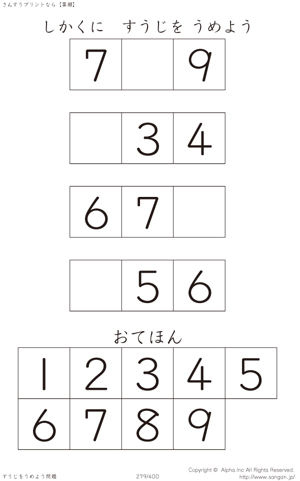 上記のボタンから「しかくにすうじをうめよう」の算数数学ドリル・計算ドリル(PDFプリント)がダウンロードできます。個人利用は無料です(家庭以外での配布は有料です)。