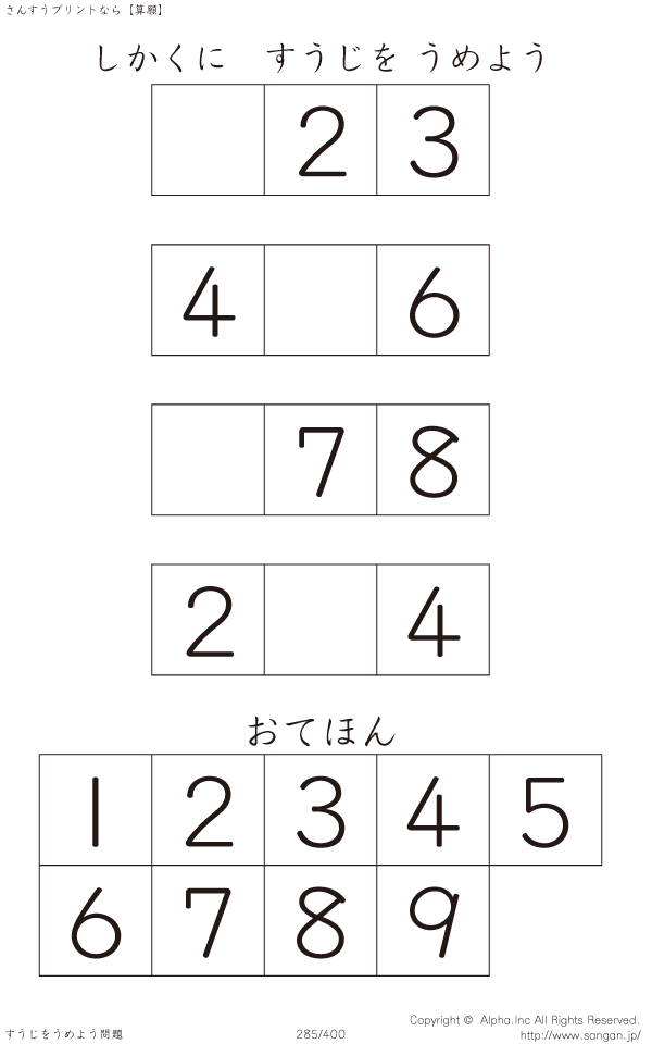 上記のボタンから「しかくにすうじをうめよう」の算数数学ドリル・計算ドリル(PDFプリント)がダウンロードできます。個人利用は無料です(家庭以外での配布は有料です)。