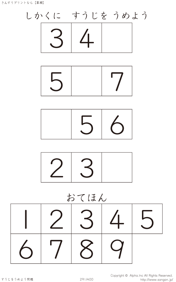 上記のボタンから「しかくにすうじをうめよう」の算数数学ドリル・計算ドリル(PDFプリント)がダウンロードできます。個人利用は無料です(家庭以外での配布は有料です)。