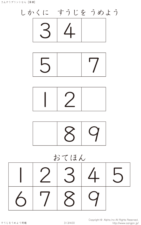 上記のボタンから「しかくにすうじをうめよう」の算数数学ドリル・計算ドリル(PDFプリント)がダウンロードできます。個人利用は無料です(家庭以外での配布は有料です)。