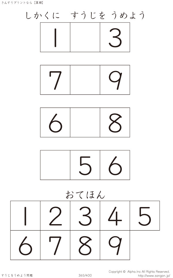 上記のボタンから「しかくにすうじをうめよう」の算数数学ドリル・計算ドリル(PDFプリント)がダウンロードできます。個人利用は無料です(家庭以外での配布は有料です)。