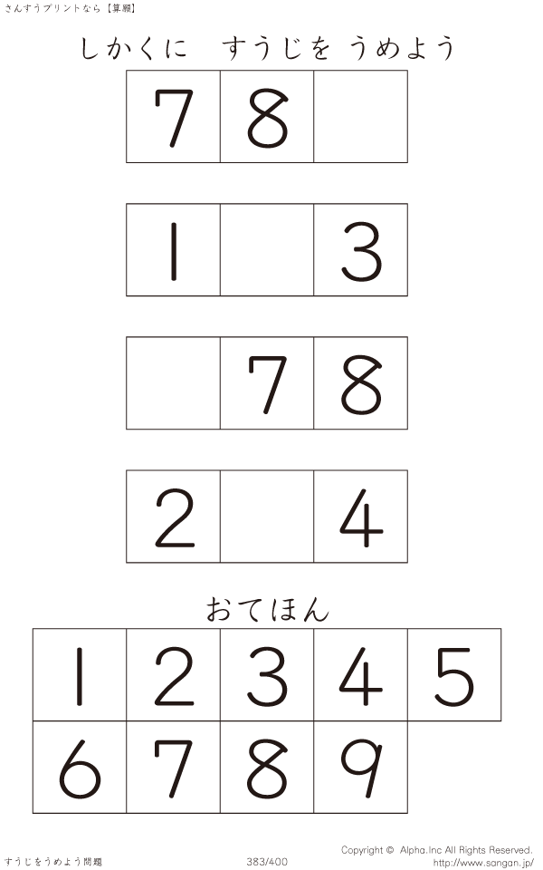 上記のボタンから「しかくにすうじをうめよう」の算数数学ドリル・計算ドリル(PDFプリント)がダウンロードできます。個人利用は無料です(家庭以外での配布は有料です)。