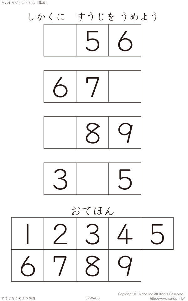 上記のボタンから「しかくにすうじをうめよう」の算数数学ドリル・計算ドリル(PDFプリント)がダウンロードできます。個人利用は無料です(家庭以外での配布は有料です)。