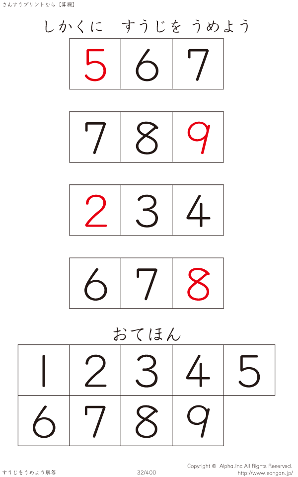 上記のボタンから「しかくにすうじをうめよう」の算数数学ドリル・計算ドリル(PDFプリント)がダウンロードできます。個人利用は無料です(家庭以外での配布は有料です)。