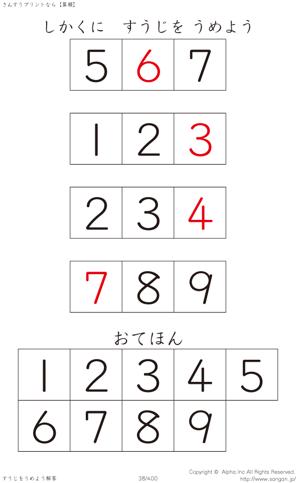 上記のボタンから「しかくにすうじをうめよう」の算数数学ドリル・計算ドリル(PDFプリント)がダウンロードできます。個人利用は無料です(家庭以外での配布は有料です)。