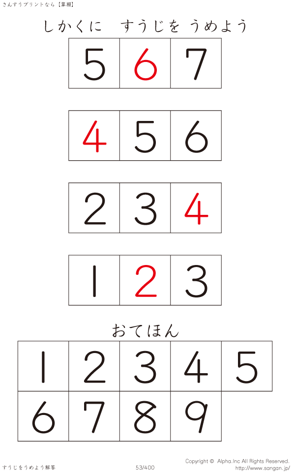 上記のボタンから「しかくにすうじをうめよう」の算数数学ドリル・計算ドリル(PDFプリント)がダウンロードできます。個人利用は無料です(家庭以外での配布は有料です)。