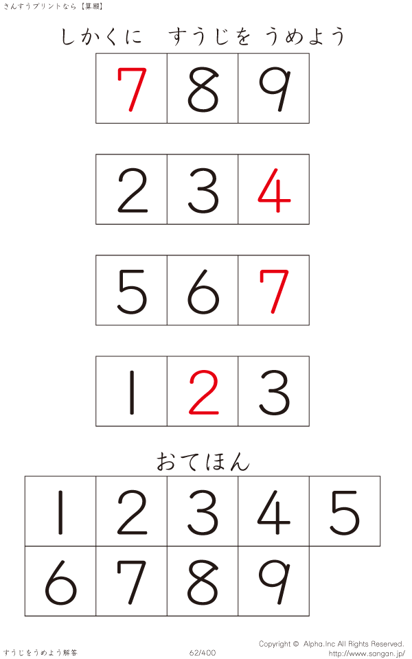 上記のボタンから「しかくにすうじをうめよう」の算数数学ドリル・計算ドリル(PDFプリント)がダウンロードできます。個人利用は無料です(家庭以外での配布は有料です)。