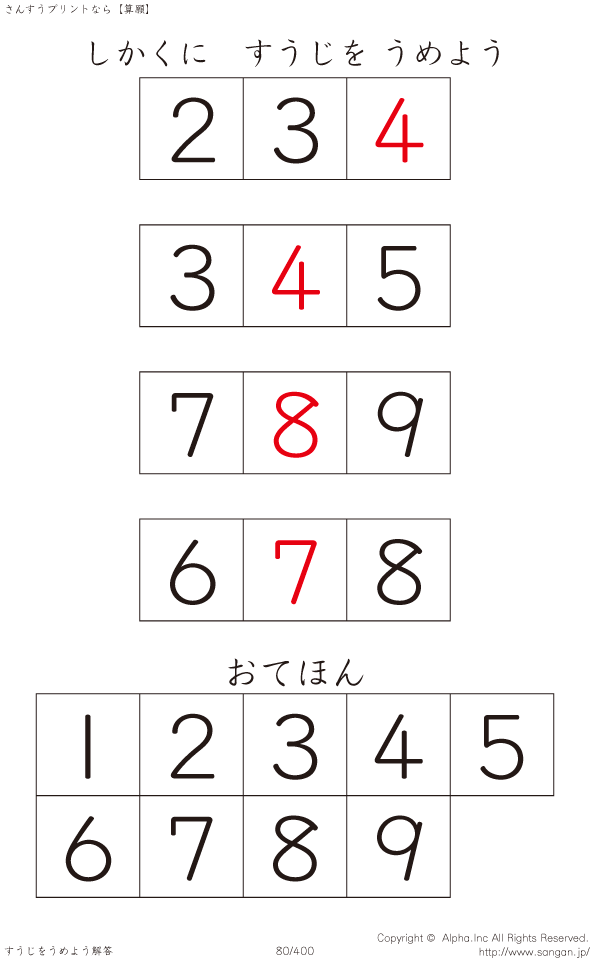 上記のボタンから「しかくにすうじをうめよう」の算数数学ドリル・計算ドリル(PDFプリント)がダウンロードできます。個人利用は無料です(家庭以外での配布は有料です)。