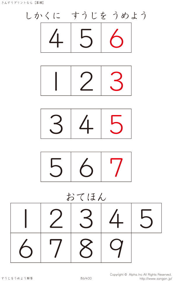 上記のボタンから「しかくにすうじをうめよう」の算数数学ドリル・計算ドリル(PDFプリント)がダウンロードできます。個人利用は無料です(家庭以外での配布は有料です)。