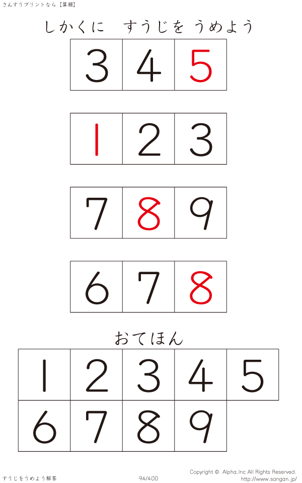 上記のボタンから「しかくにすうじをうめよう」の算数数学ドリル・計算ドリル(PDFプリント)がダウンロードできます。個人利用は無料です(家庭以外での配布は有料です)。