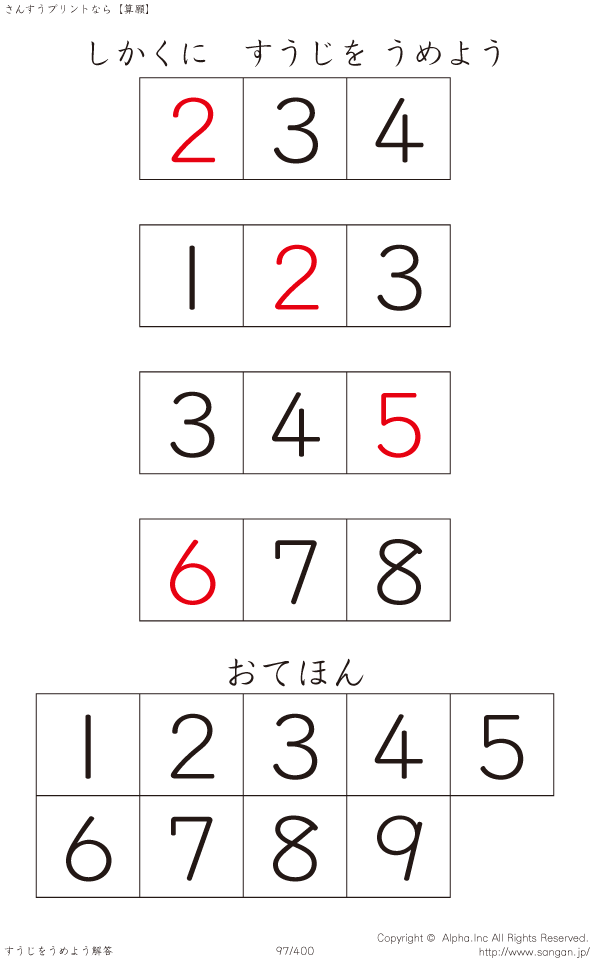 上記のボタンから「しかくにすうじをうめよう」の算数数学ドリル・計算ドリル(PDFプリント)がダウンロードできます。個人利用は無料です(家庭以外での配布は有料です)。