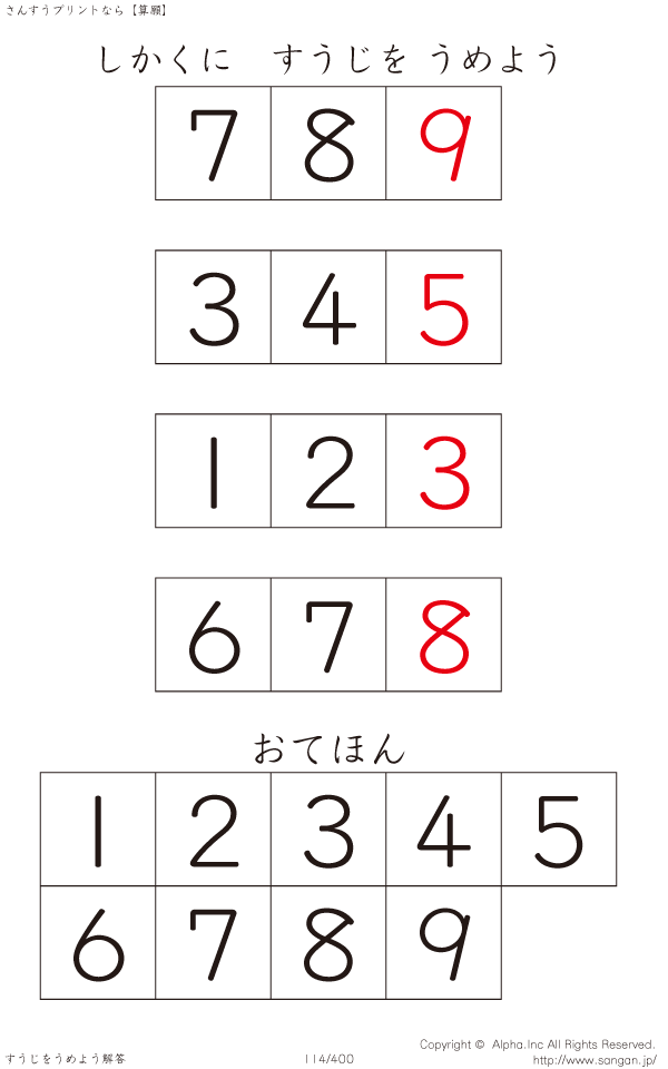 上記のボタンから「しかくにすうじをうめよう」の算数数学ドリル・計算ドリル(PDFプリント)がダウンロードできます。個人利用は無料です(家庭以外での配布は有料です)。