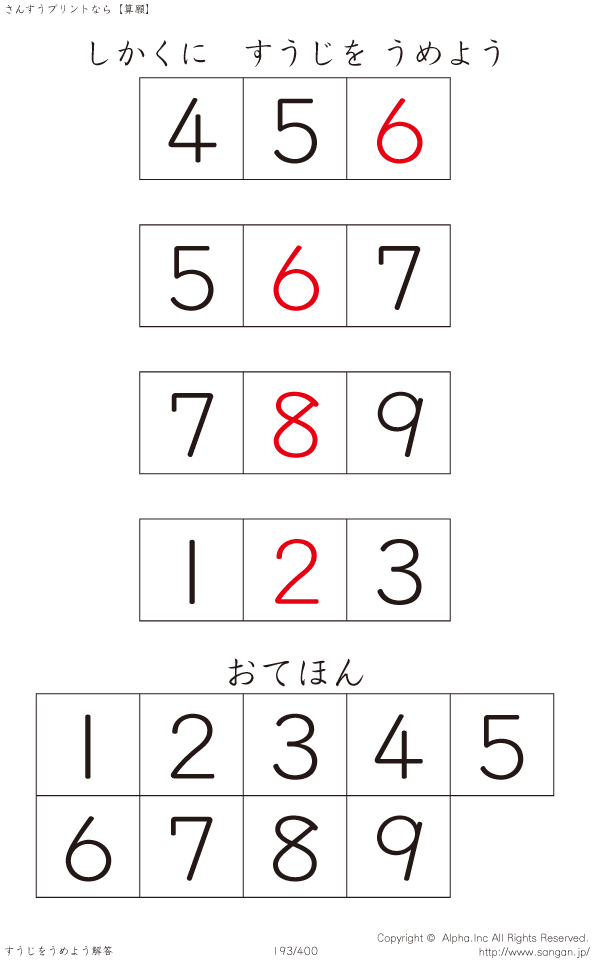 上記のボタンから「しかくにすうじをうめよう」の算数数学ドリル・計算ドリル(PDFプリント)がダウンロードできます。個人利用は無料です(家庭以外での配布は有料です)。