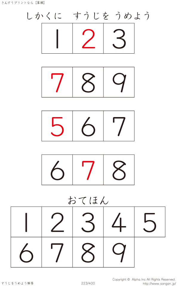 上記のボタンから「しかくにすうじをうめよう」の算数数学ドリル・計算ドリル(PDFプリント)がダウンロードできます。個人利用は無料です(家庭以外での配布は有料です)。