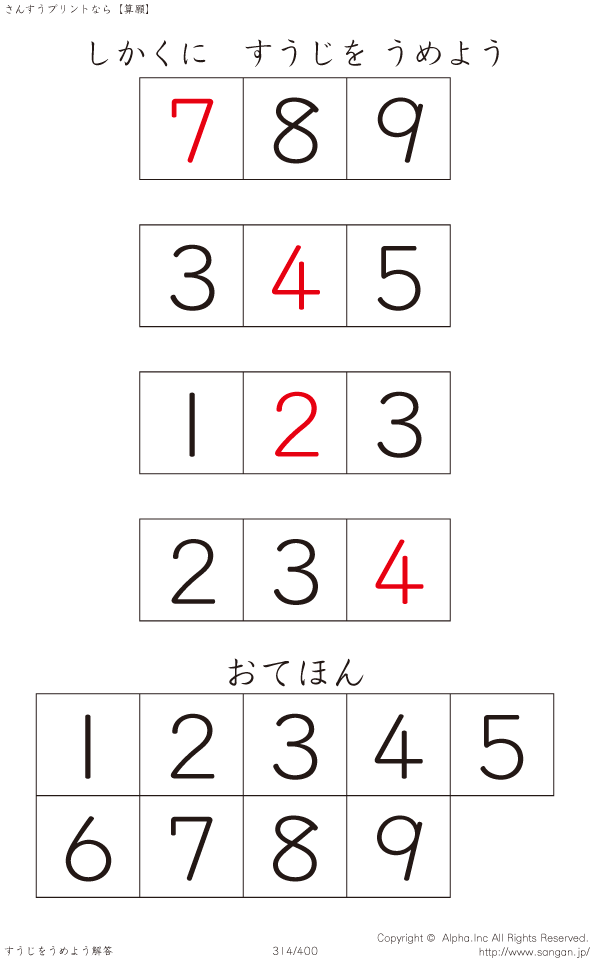 上記のボタンから「しかくにすうじをうめよう」の算数数学ドリル・計算ドリル(PDFプリント)がダウンロードできます。個人利用は無料です(家庭以外での配布は有料です)。