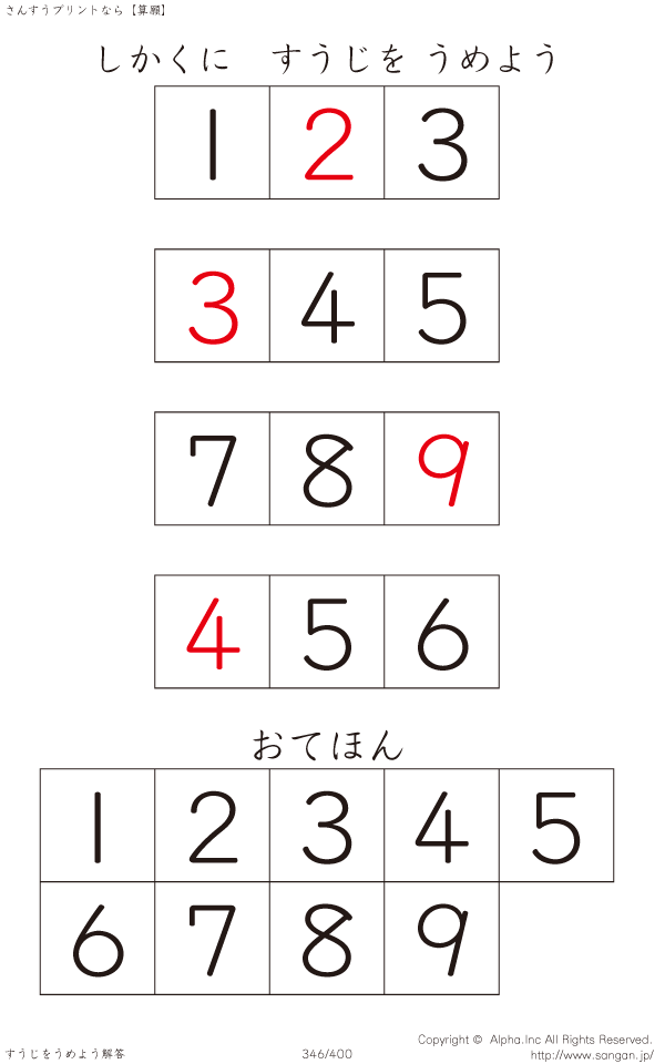 上記のボタンから「しかくにすうじをうめよう」の算数数学ドリル・計算ドリル(PDFプリント)がダウンロードできます。個人利用は無料です(家庭以外での配布は有料です)。