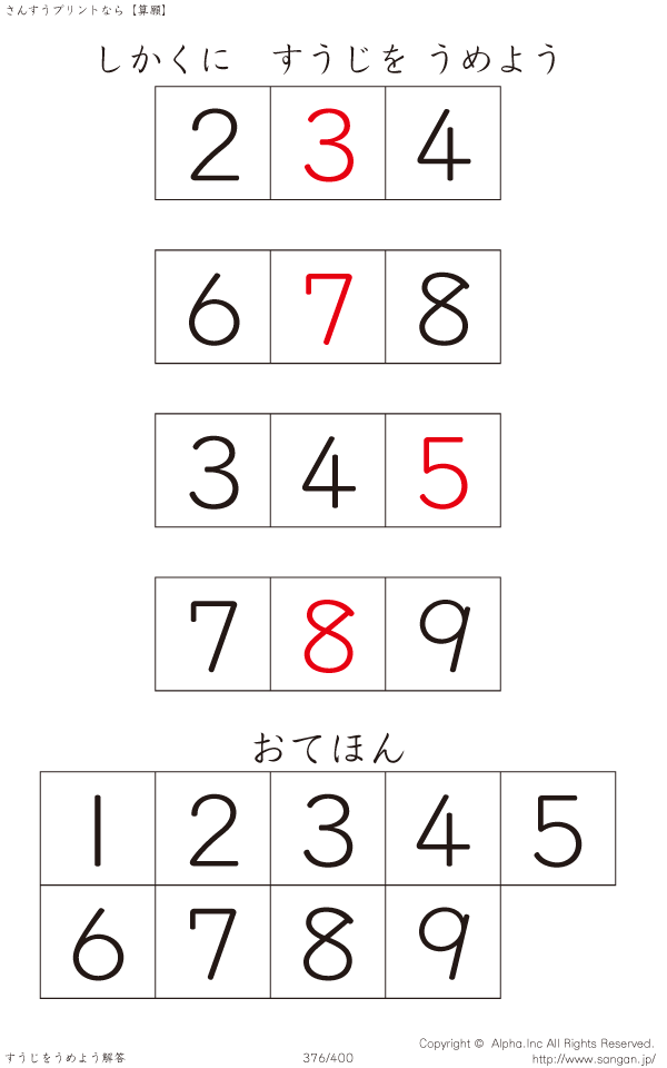 上記のボタンから「しかくにすうじをうめよう」の算数数学ドリル・計算ドリル(PDFプリント)がダウンロードできます。個人利用は無料です(家庭以外での配布は有料です)。