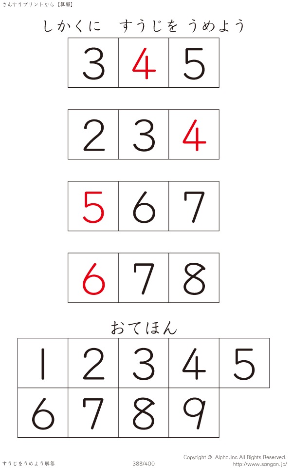 上記のボタンから「しかくにすうじをうめよう」の算数数学ドリル・計算ドリル(PDFプリント)がダウンロードできます。個人利用は無料です(家庭以外での配布は有料です)。