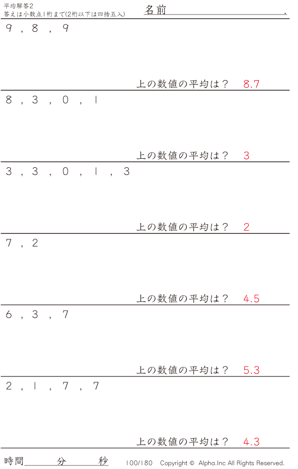 上記のボタンから「平均2割り切れない/9まで」の算数数学ドリル・計算ドリル(PDFプリント)がダウンロードできます。個人利用は無料です(家庭以外での配布は有料です)。