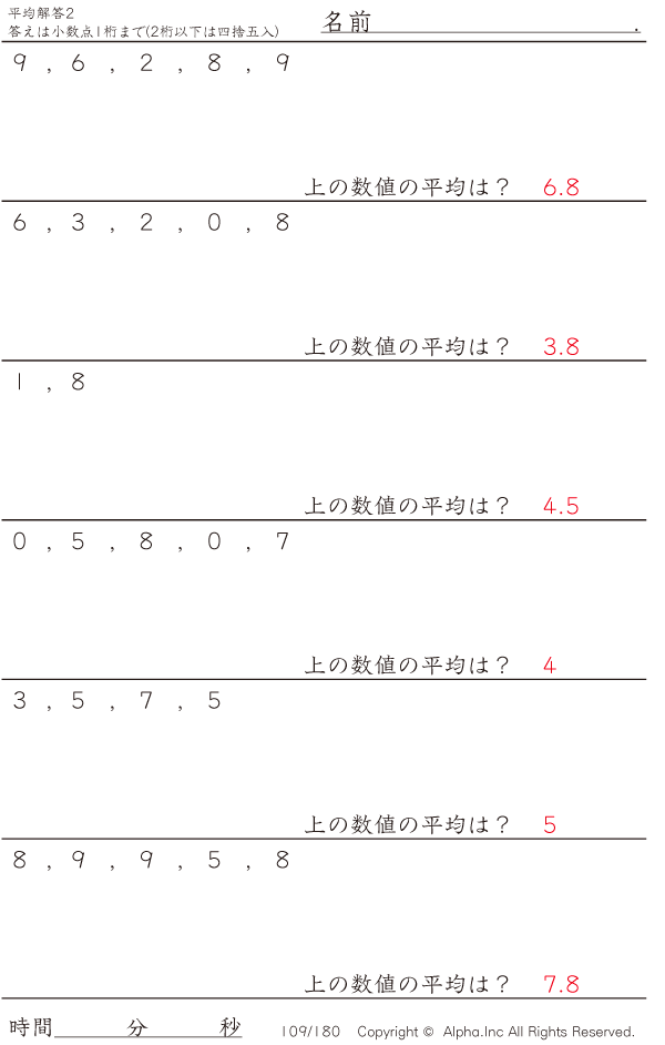 上記のボタンから「平均2割り切れない/9まで」の算数数学ドリル・計算ドリル(PDFプリント)がダウンロードできます。個人利用は無料です(家庭以外での配布は有料です)。