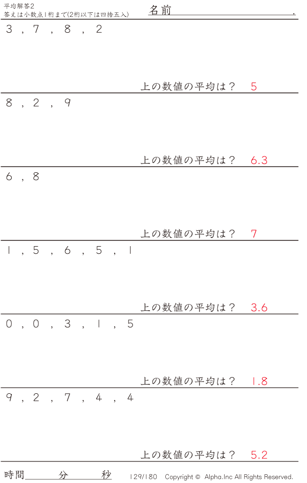 上記のボタンから「平均2割り切れない/9まで」の算数数学ドリル・計算ドリル(PDFプリント)がダウンロードできます。個人利用は無料です(家庭以外での配布は有料です)。
