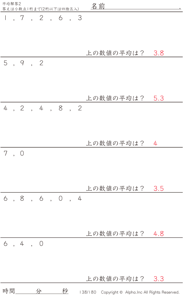 上記のボタンから「平均2割り切れない/9まで」の算数数学ドリル・計算ドリル(PDFプリント)がダウンロードできます。個人利用は無料です(家庭以外での配布は有料です)。
