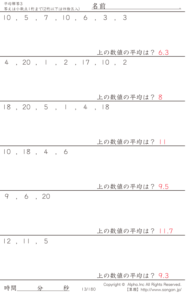 上記のボタンから「平均3割り切れない/20まで」の算数数学ドリル・計算ドリル(PDFプリント)がダウンロードできます。個人利用は無料です(家庭以外での配布は有料です)。