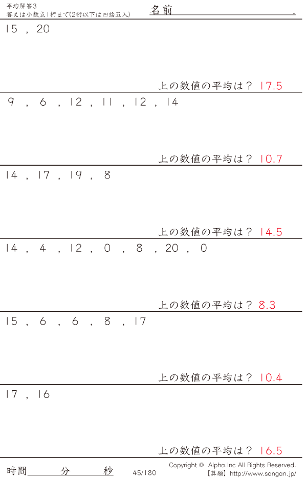 上記のボタンから「平均3割り切れない/20まで」の算数数学ドリル・計算ドリル(PDFプリント)がダウンロードできます。個人利用は無料です(家庭以外での配布は有料です)。