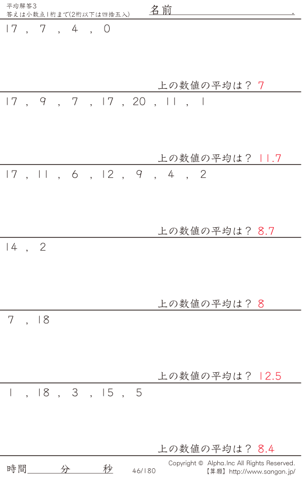 上記のボタンから「平均3割り切れない/20まで」の算数数学ドリル・計算ドリル(PDFプリント)がダウンロードできます。個人利用は無料です(家庭以外での配布は有料です)。