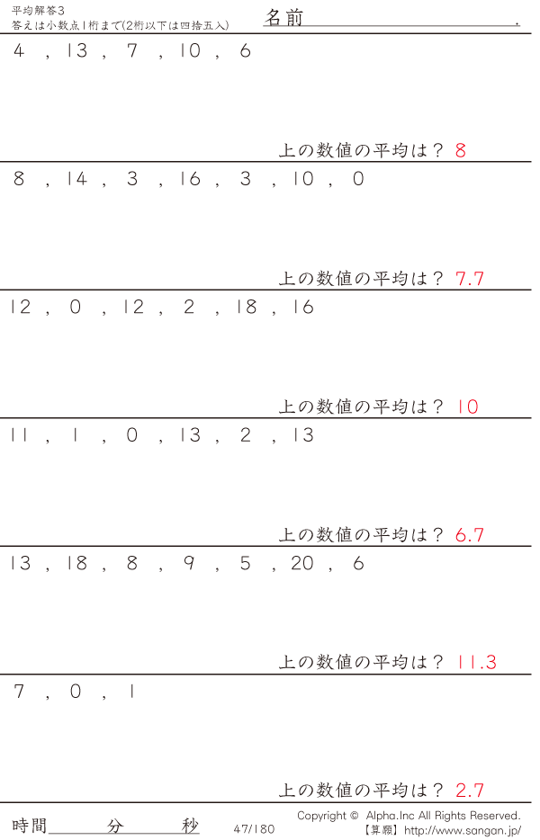 上記のボタンから「平均3割り切れない/20まで」の算数数学ドリル・計算ドリル(PDFプリント)がダウンロードできます。個人利用は無料です(家庭以外での配布は有料です)。