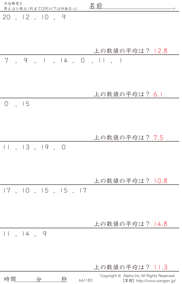 上記のボタンから「平均3割り切れない/20まで」の算数数学ドリル・計算ドリル(PDFプリント)がダウンロードできます。個人利用は無料です(家庭以外での配布は有料です)。
