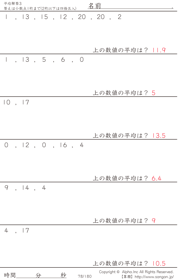 上記のボタンから「平均3割り切れない/20まで」の算数数学ドリル・計算ドリル(PDFプリント)がダウンロードできます。個人利用は無料です(家庭以外での配布は有料です)。
