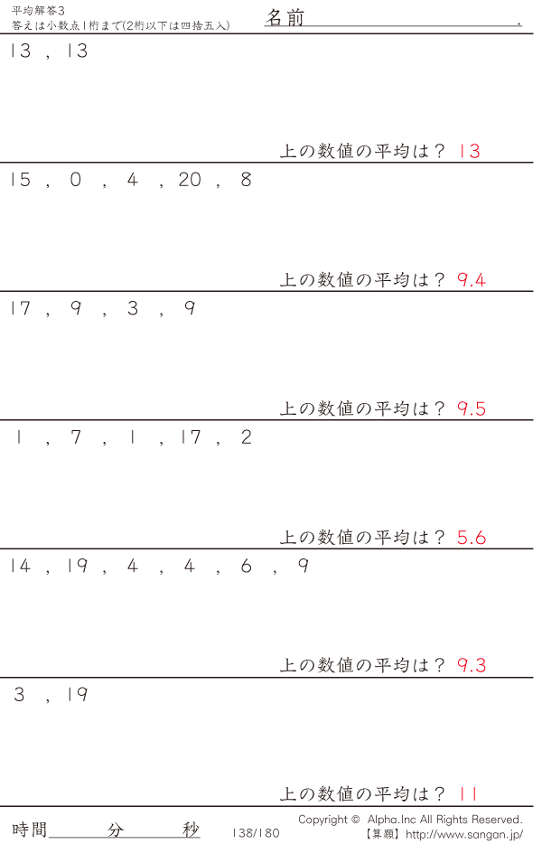 上記のボタンから「平均3割り切れない/20まで」の算数数学ドリル・計算ドリル(PDFプリント)がダウンロードできます。個人利用は無料です(家庭以外での配布は有料です)。
