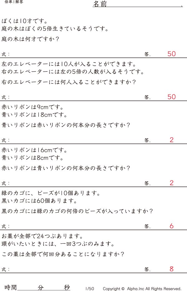 上記のボタンから「倍率1(整数で解答)」の算数数学ドリル・計算ドリル(PDFプリント)がダウンロードできます。個人利用は無料です(家庭以外での配布は有料です)。
