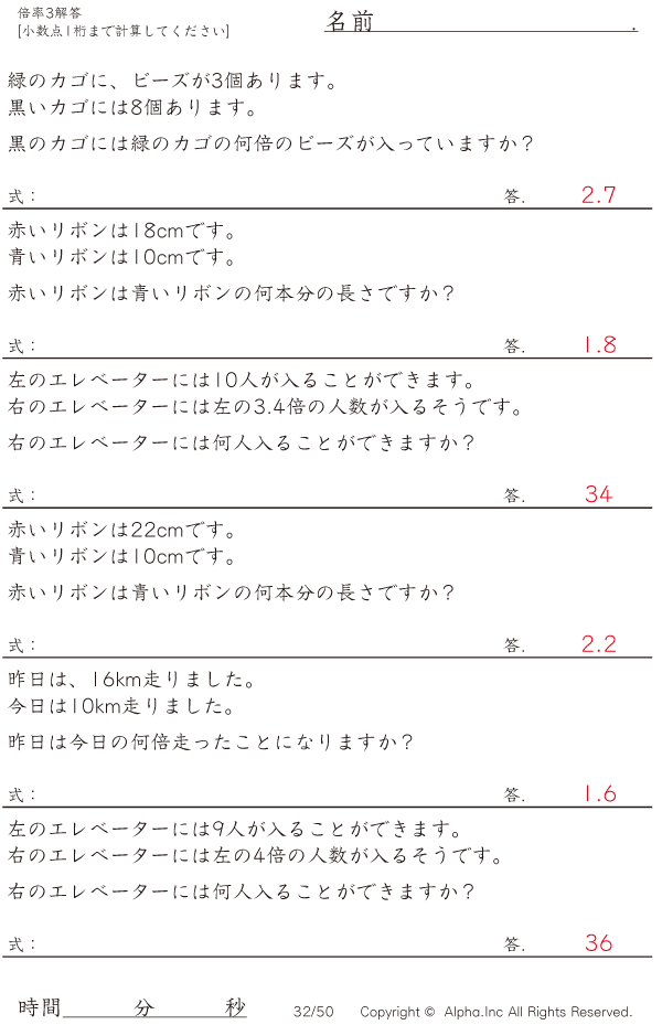 上記のボタンから「倍率3(倍率0.1単位)」の算数数学ドリル・計算ドリル(PDFプリント)がダウンロードできます。個人利用は無料です(家庭以外での配布は有料です)。