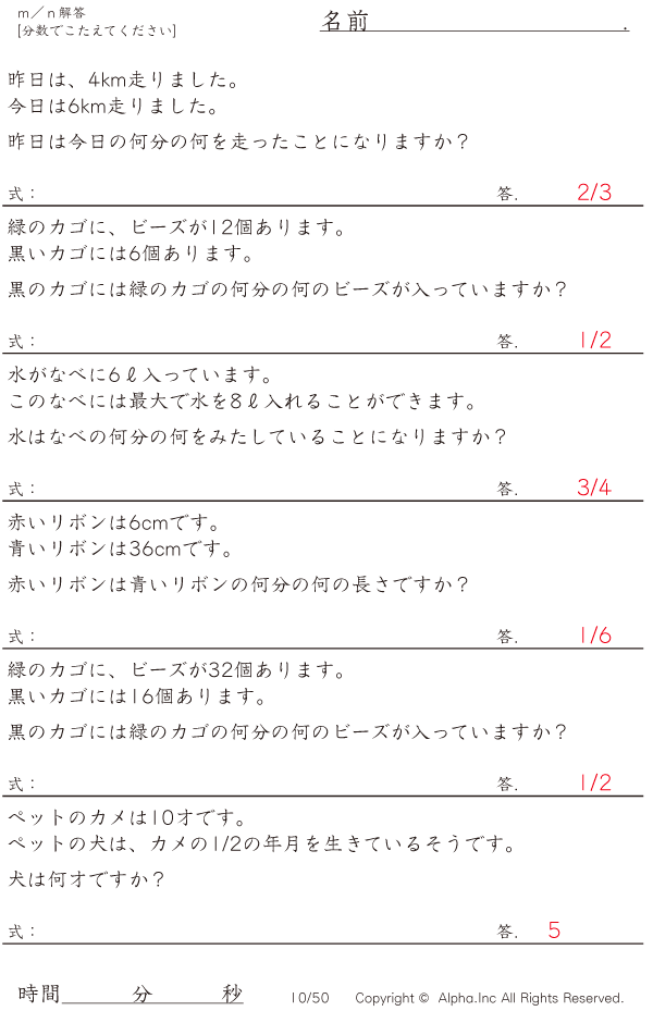 上記のボタンから「m/n(倍率何分の何ですか)」の算数数学ドリル・計算ドリル(PDFプリント)がダウンロードできます。個人利用は無料です(家庭以外での配布は有料です)。
