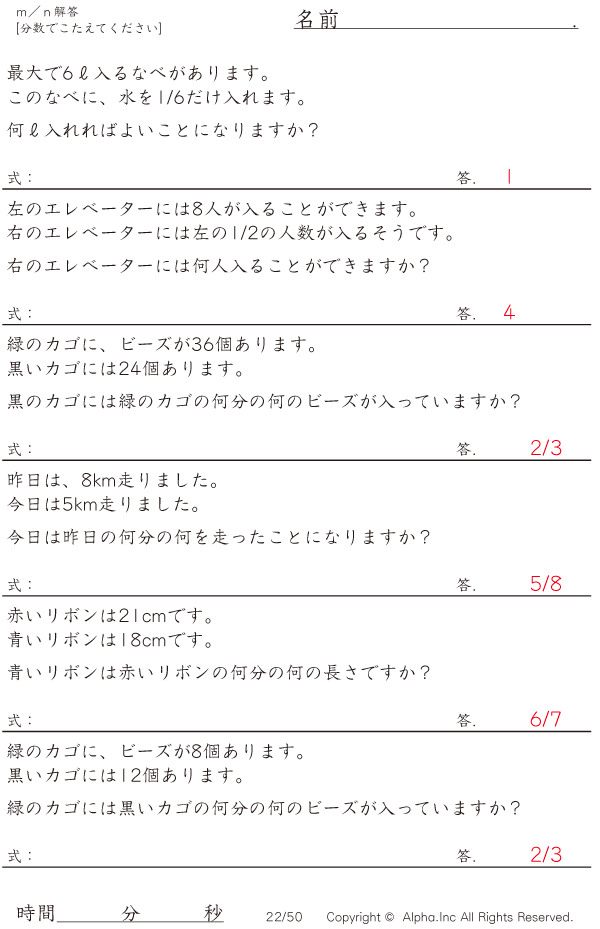 上記のボタンから「m/n(倍率何分の何ですか)」の算数数学ドリル・計算ドリル(PDFプリント)がダウンロードできます。個人利用は無料です(家庭以外での配布は有料です)。