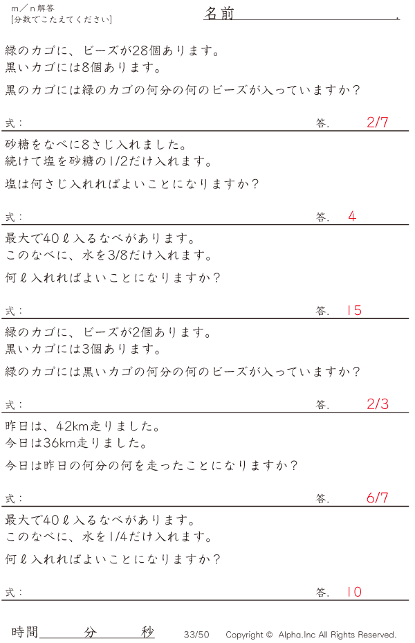 上記のボタンから「m/n(倍率何分の何ですか)」の算数数学ドリル・計算ドリル(PDFプリント)がダウンロードできます。個人利用は無料です(家庭以外での配布は有料です)。