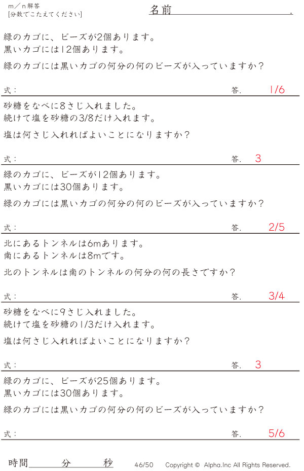 上記のボタンから「m/n(倍率何分の何ですか)」の算数数学ドリル・計算ドリル(PDFプリント)がダウンロードできます。個人利用は無料です(家庭以外での配布は有料です)。