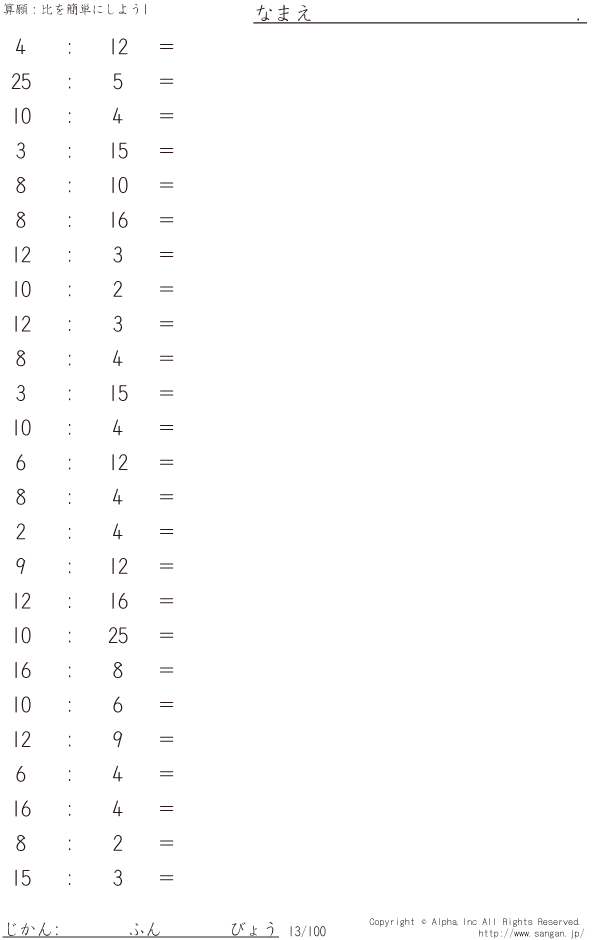 上記のボタンから「比を簡単にしよう1(易)」の算数数学ドリル・計算ドリル(PDFプリント)がダウンロードできます。個人利用は無料です(家庭以外での配布は有料です)。