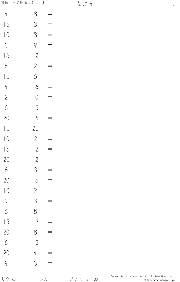 上記のボタンから「比を簡単にしよう1(易)」の算数数学ドリル・計算ドリル(PDFプリント)がダウンロードできます。個人利用は無料です(家庭以外での配布は有料です)。